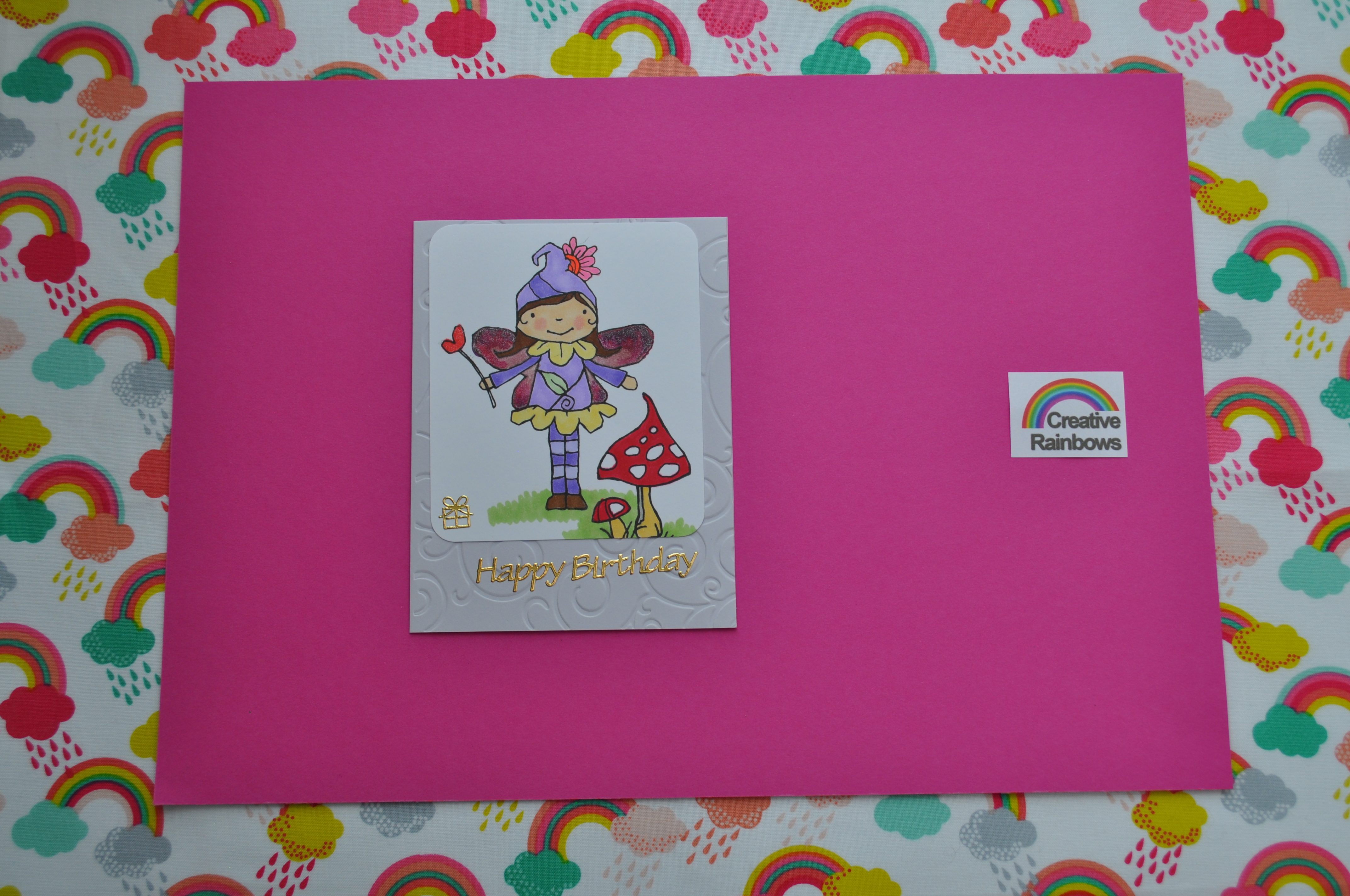 Pink card, white mount, stamped and coloured fairy toadstool, gold happy birthday
