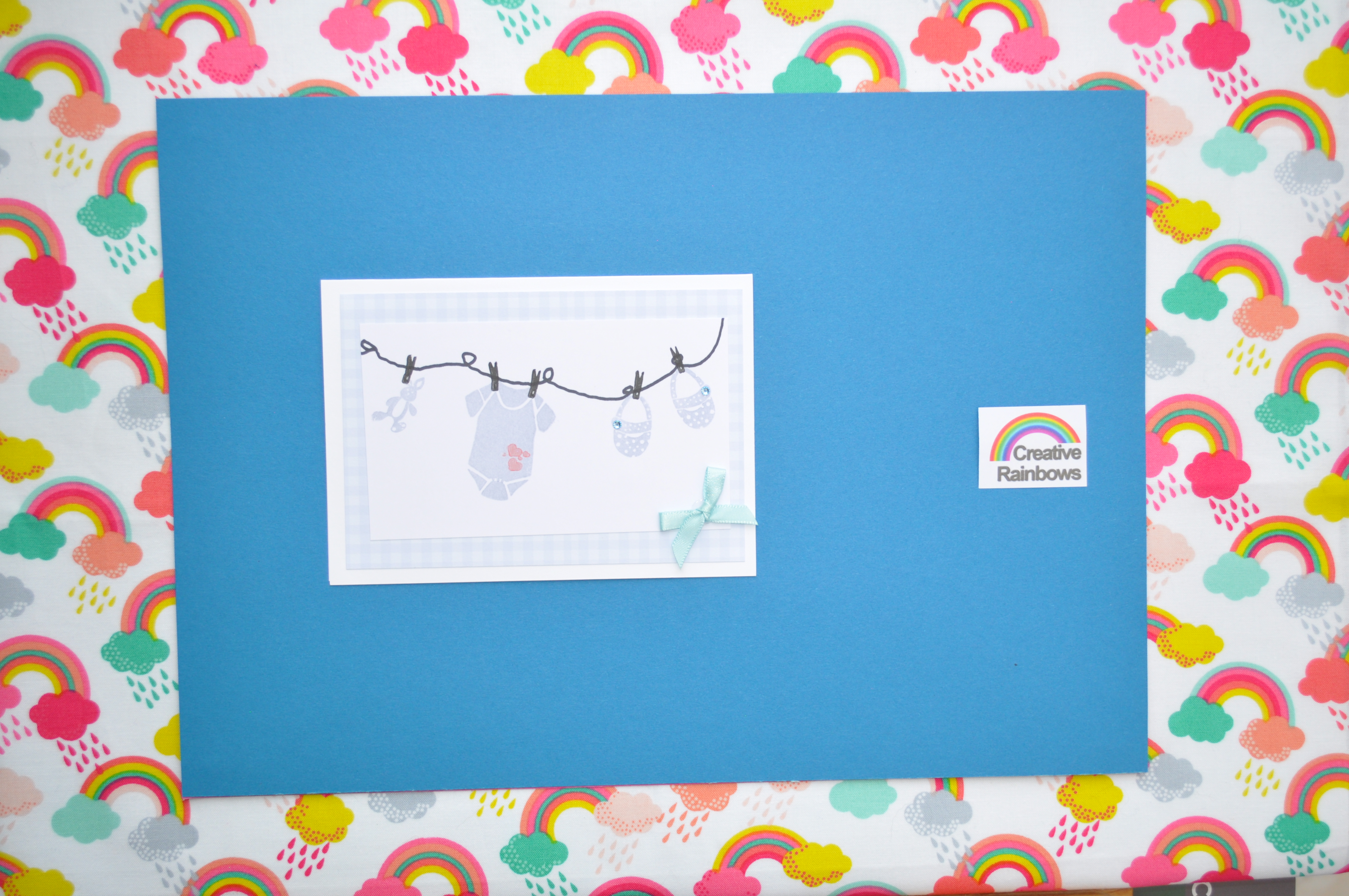White card, blue check mount, washing line with blue baby clothes, blue crystals on shoes
