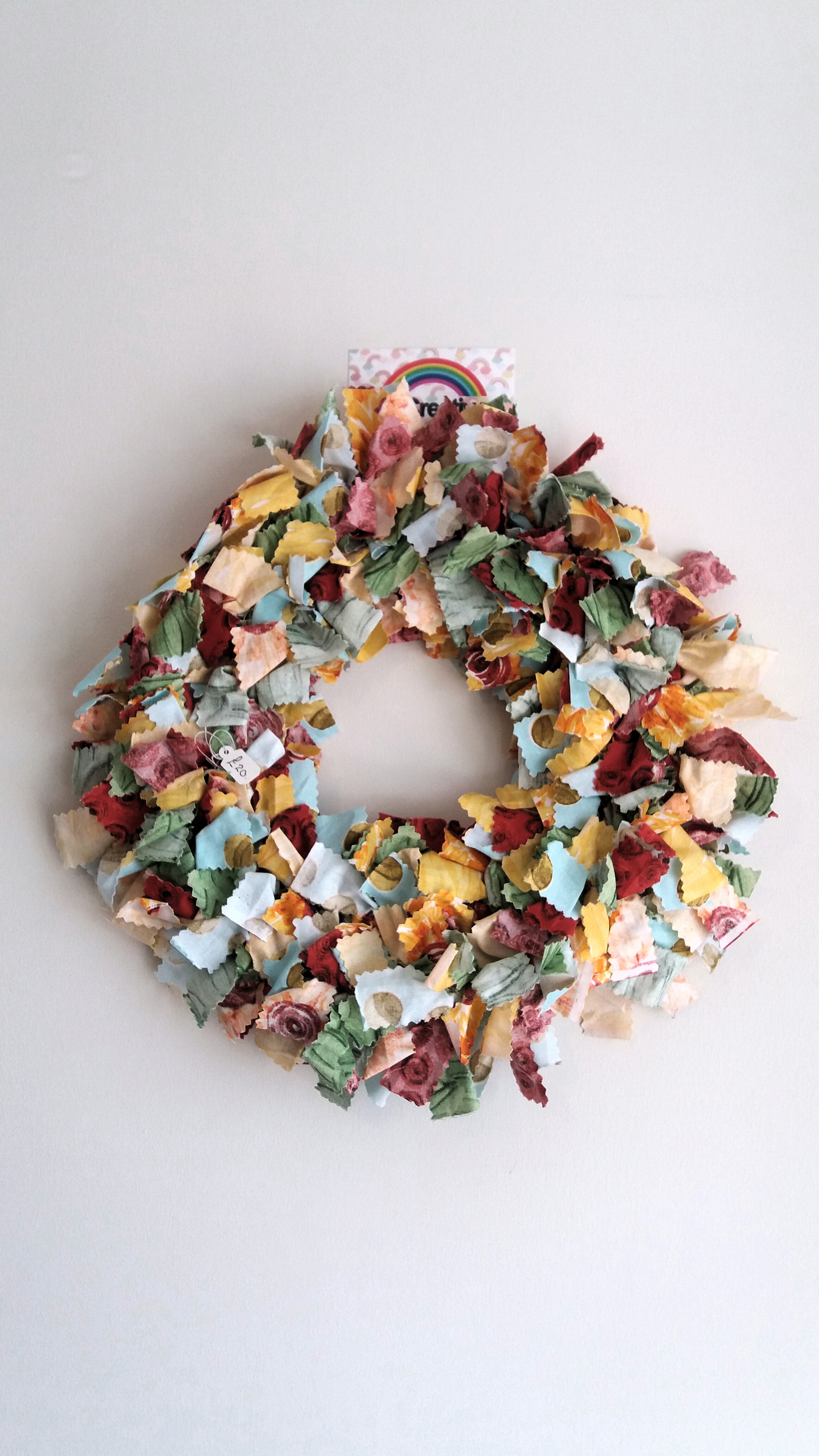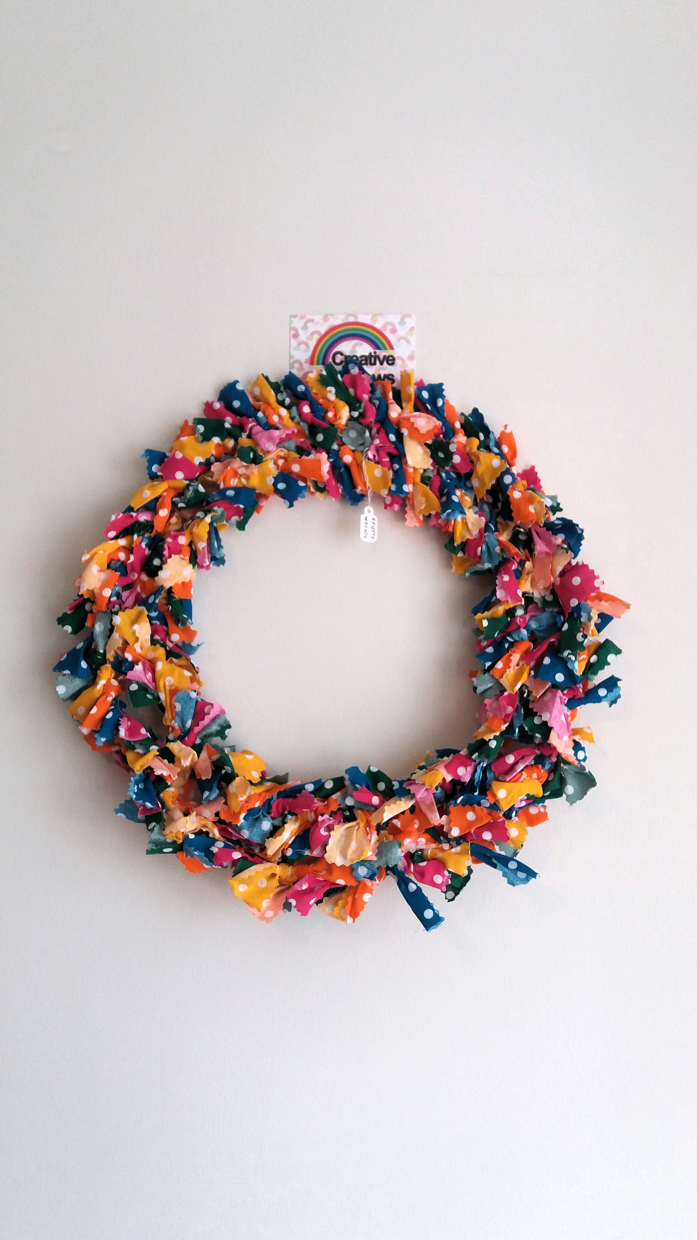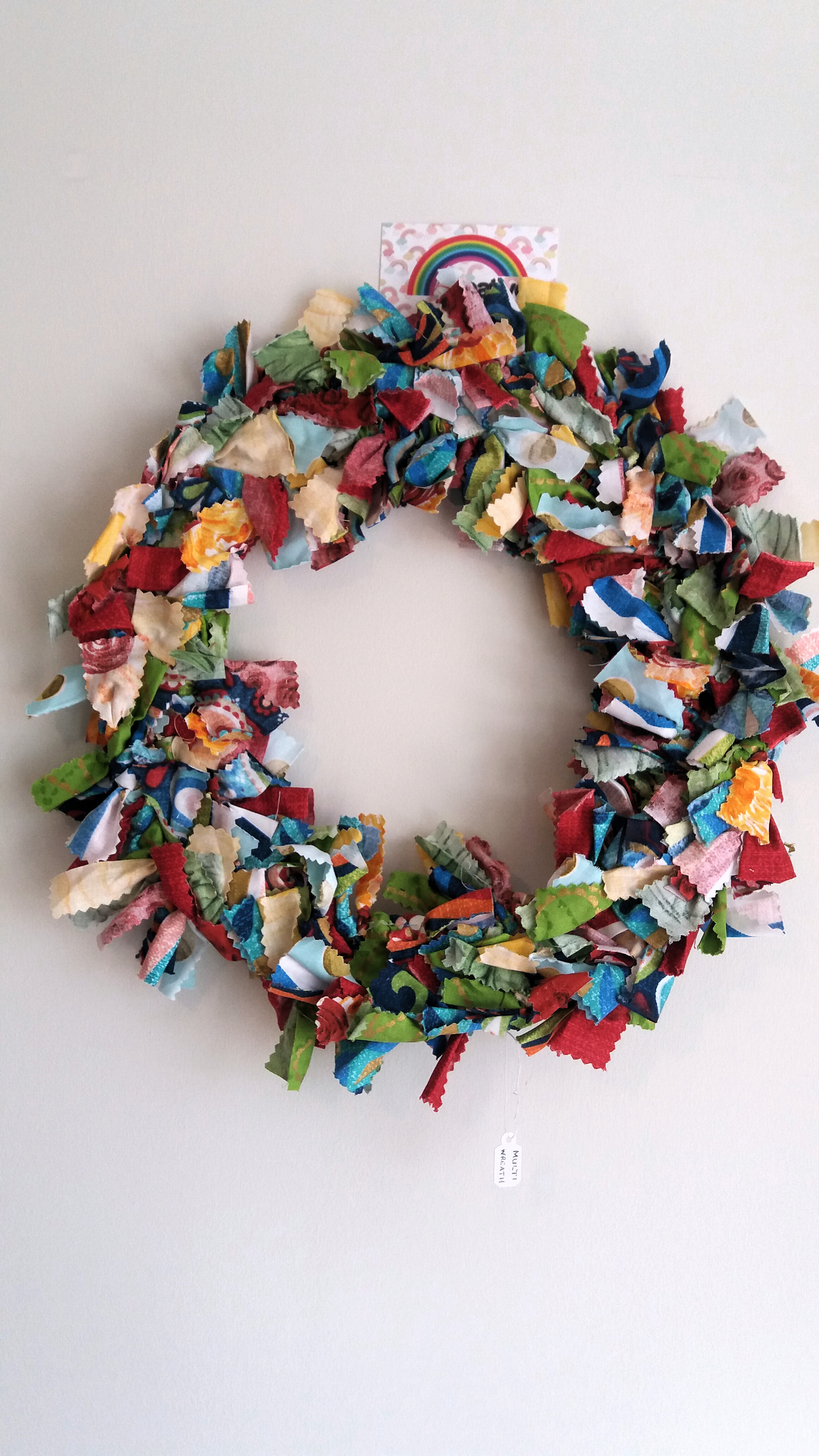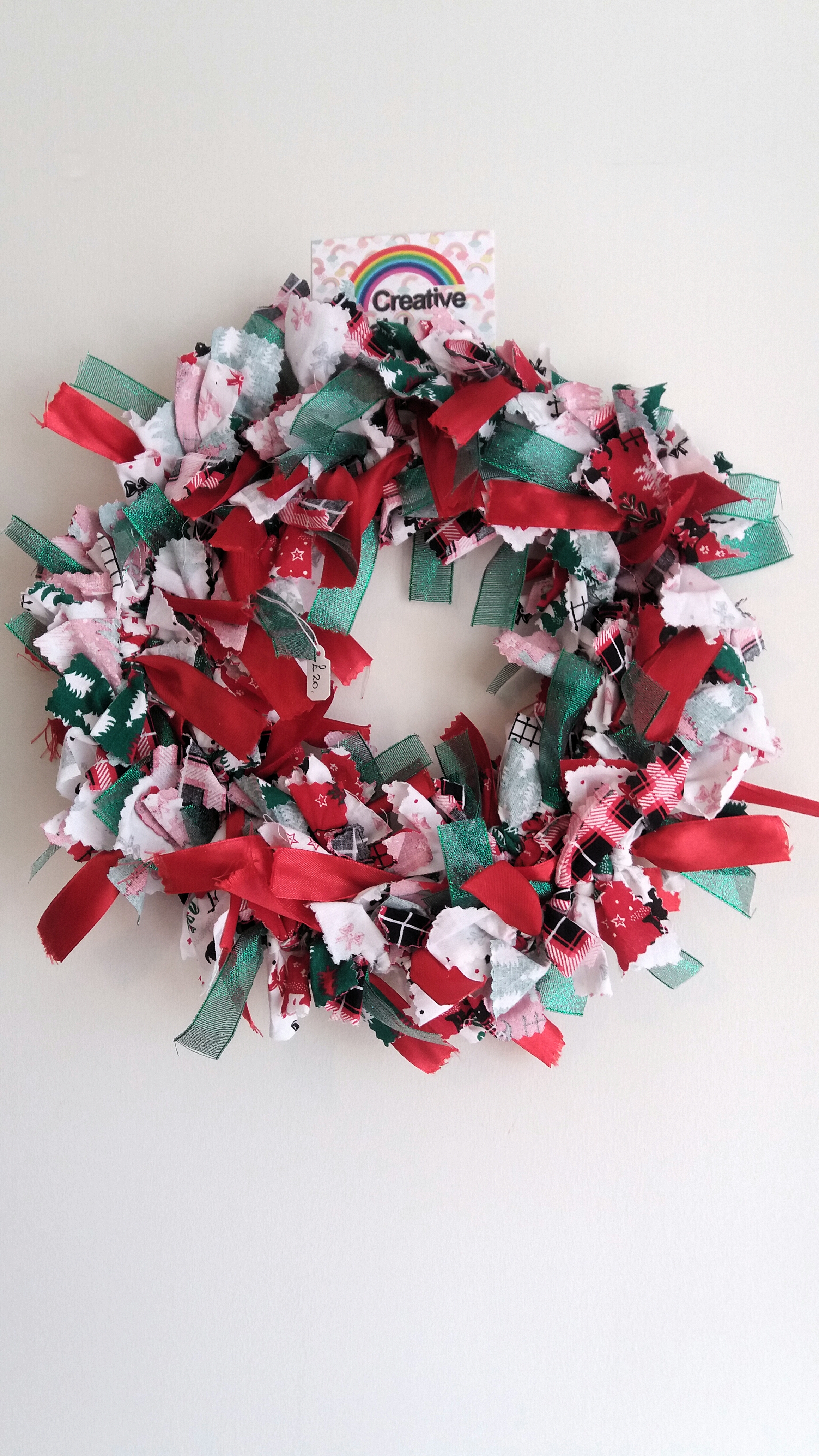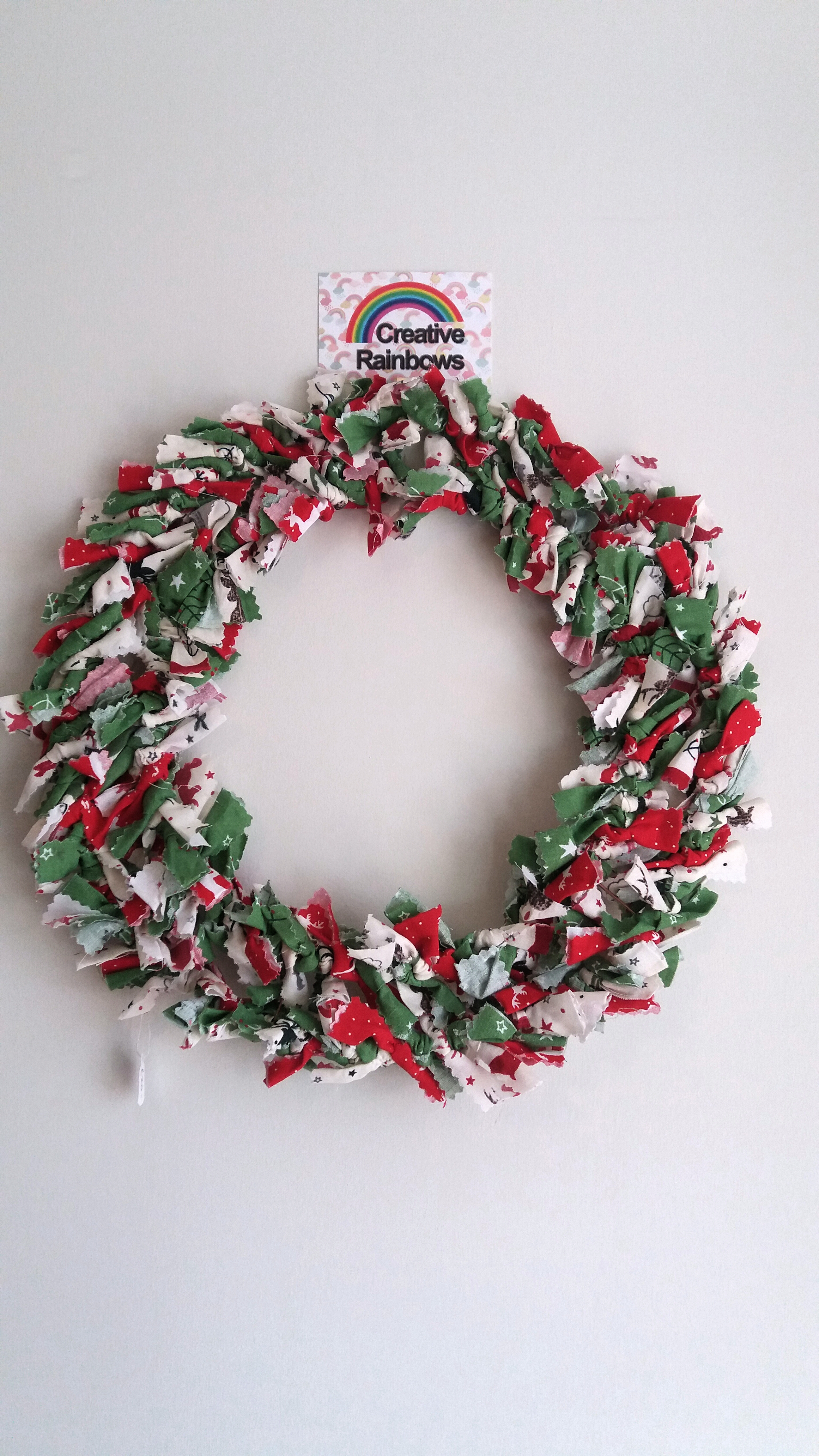Rag wreath shaggy Christmas design red green and white colours