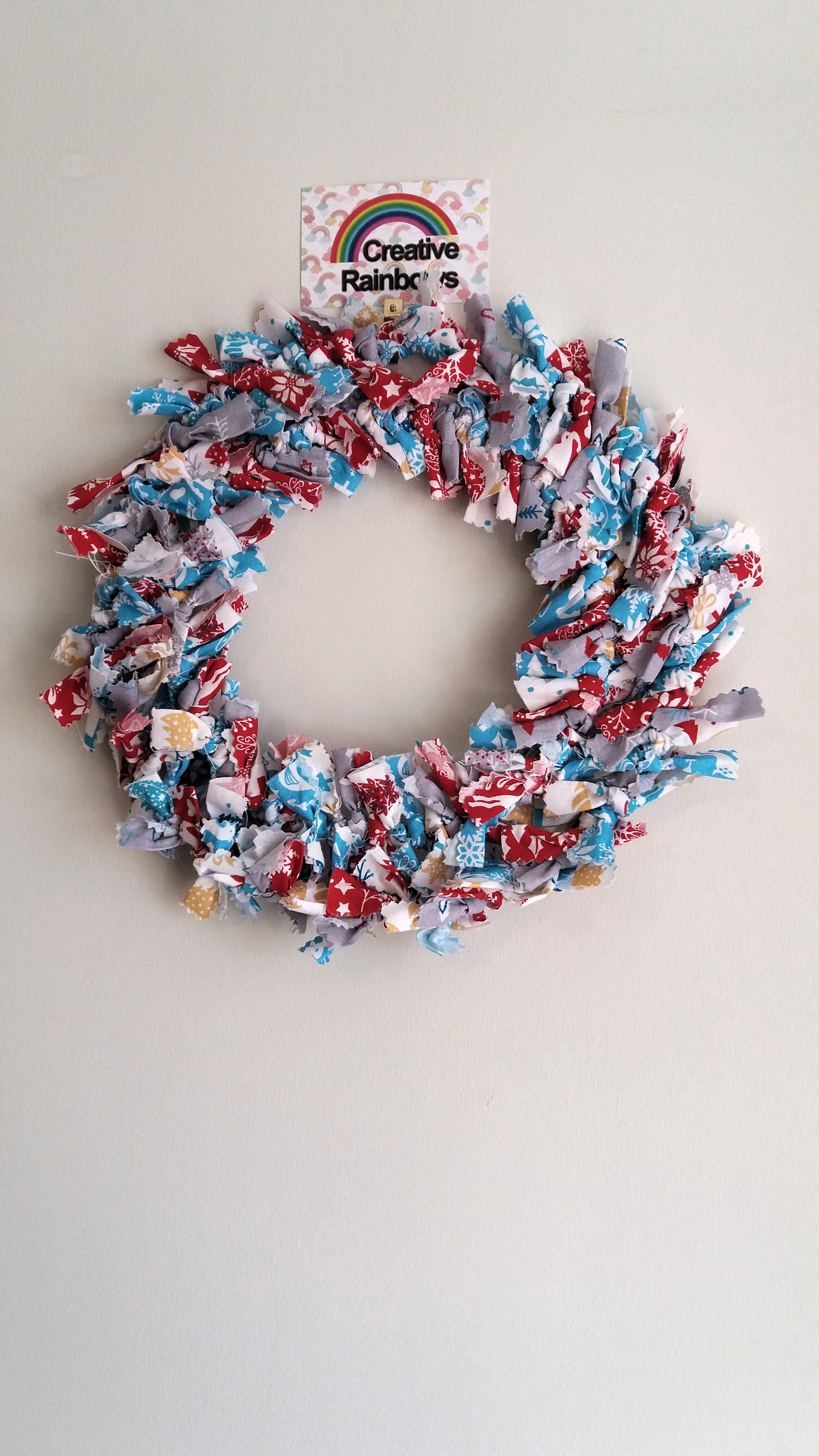 Rag wreath Christmas blue white and red colours