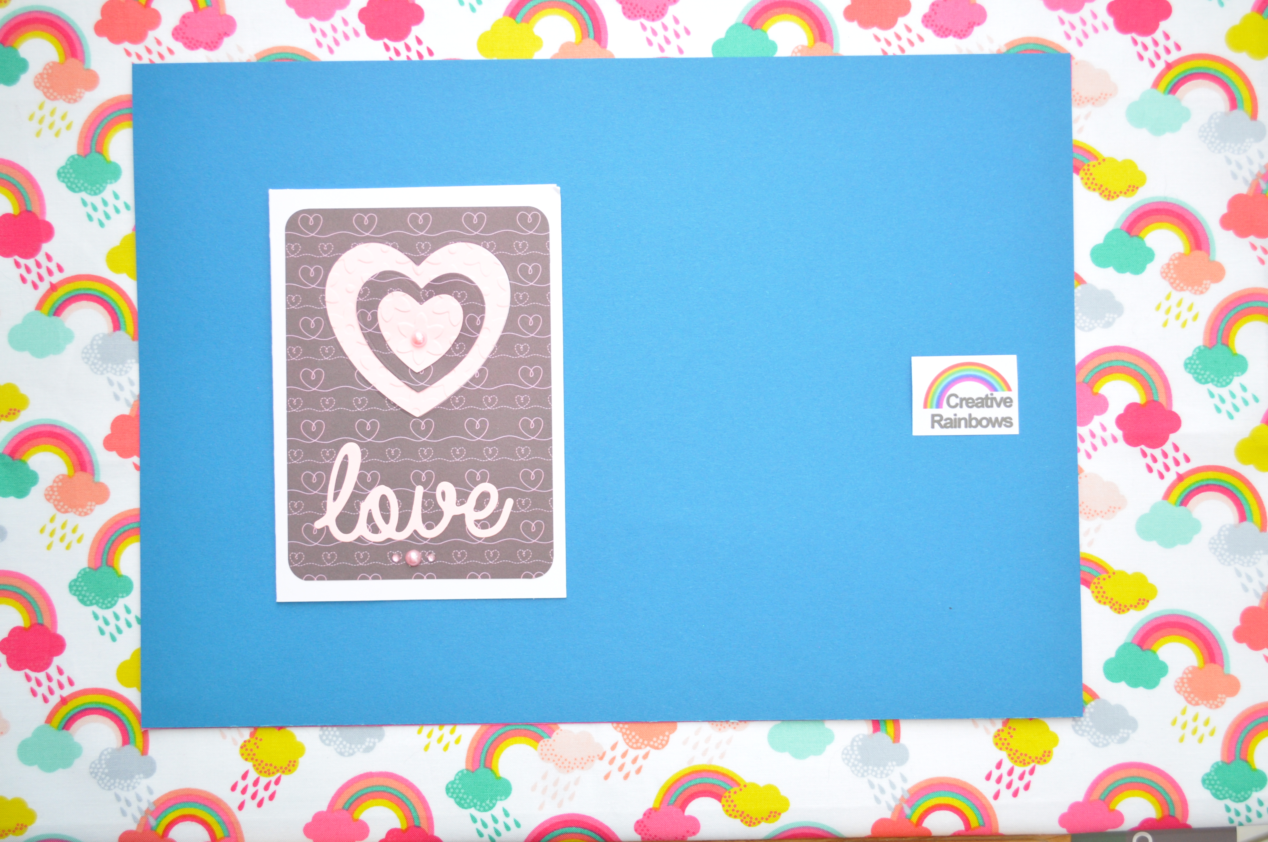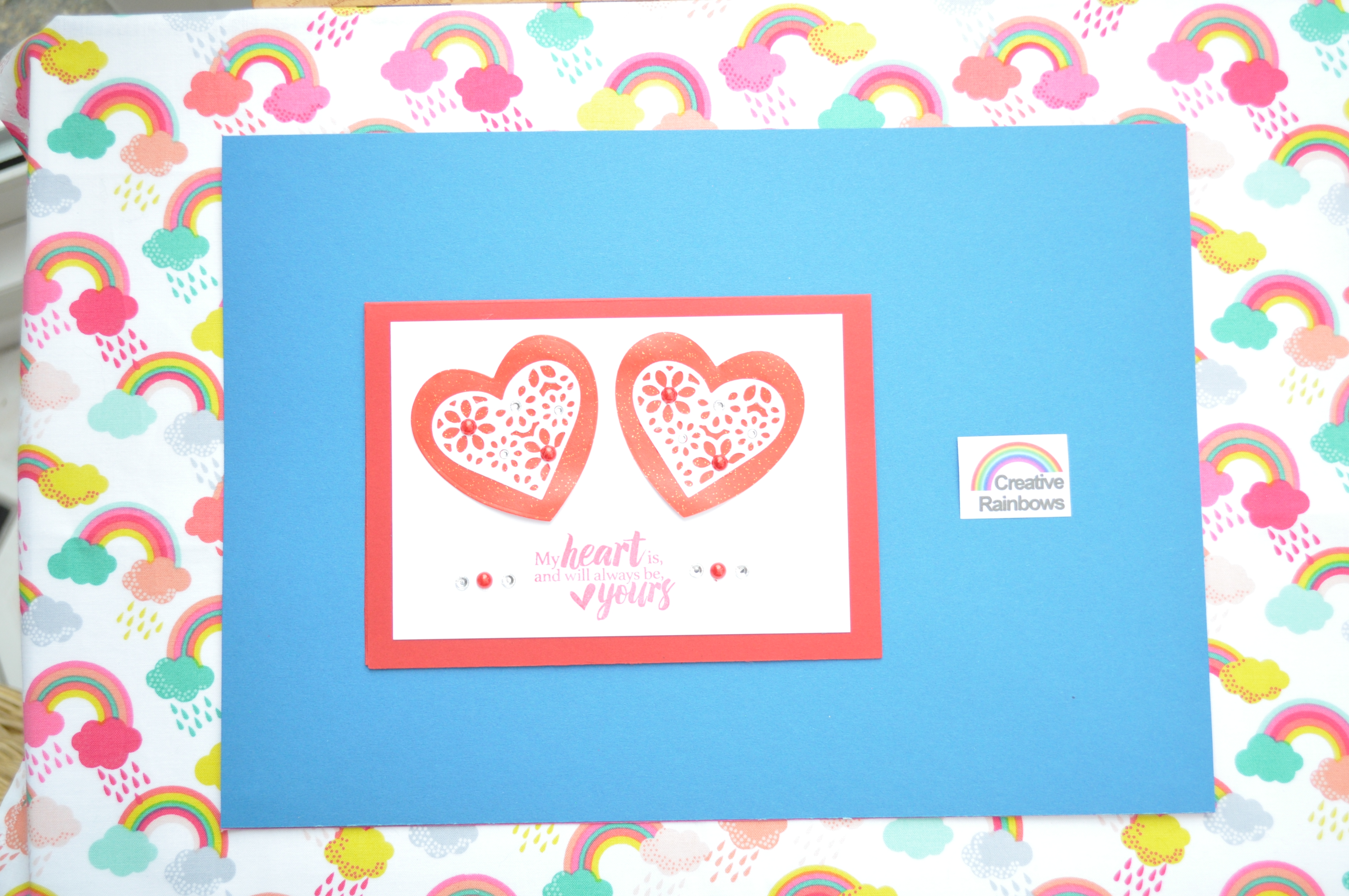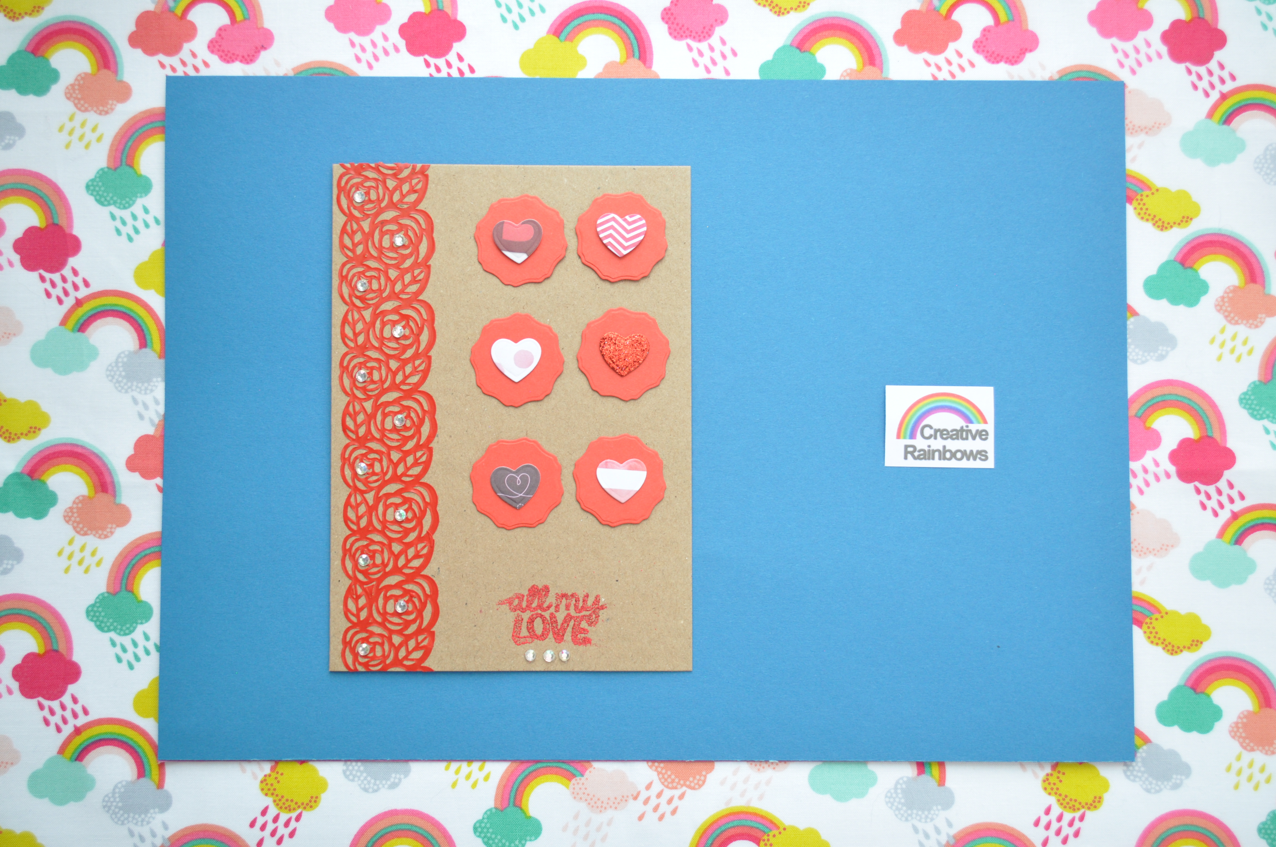 Brown card, red silver lace tape to left side with jewels, 6 mounted red heart shapes, red all my love |