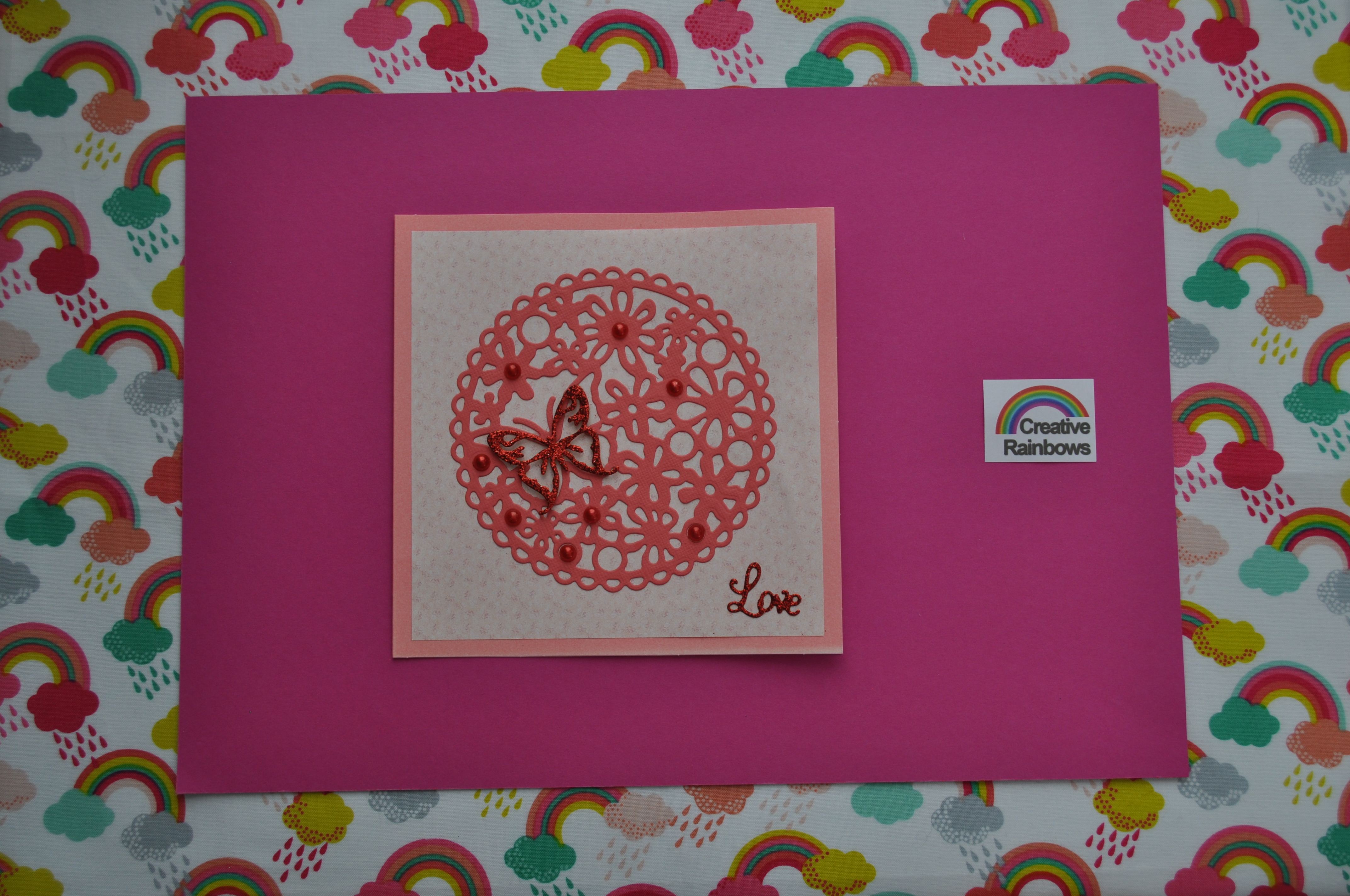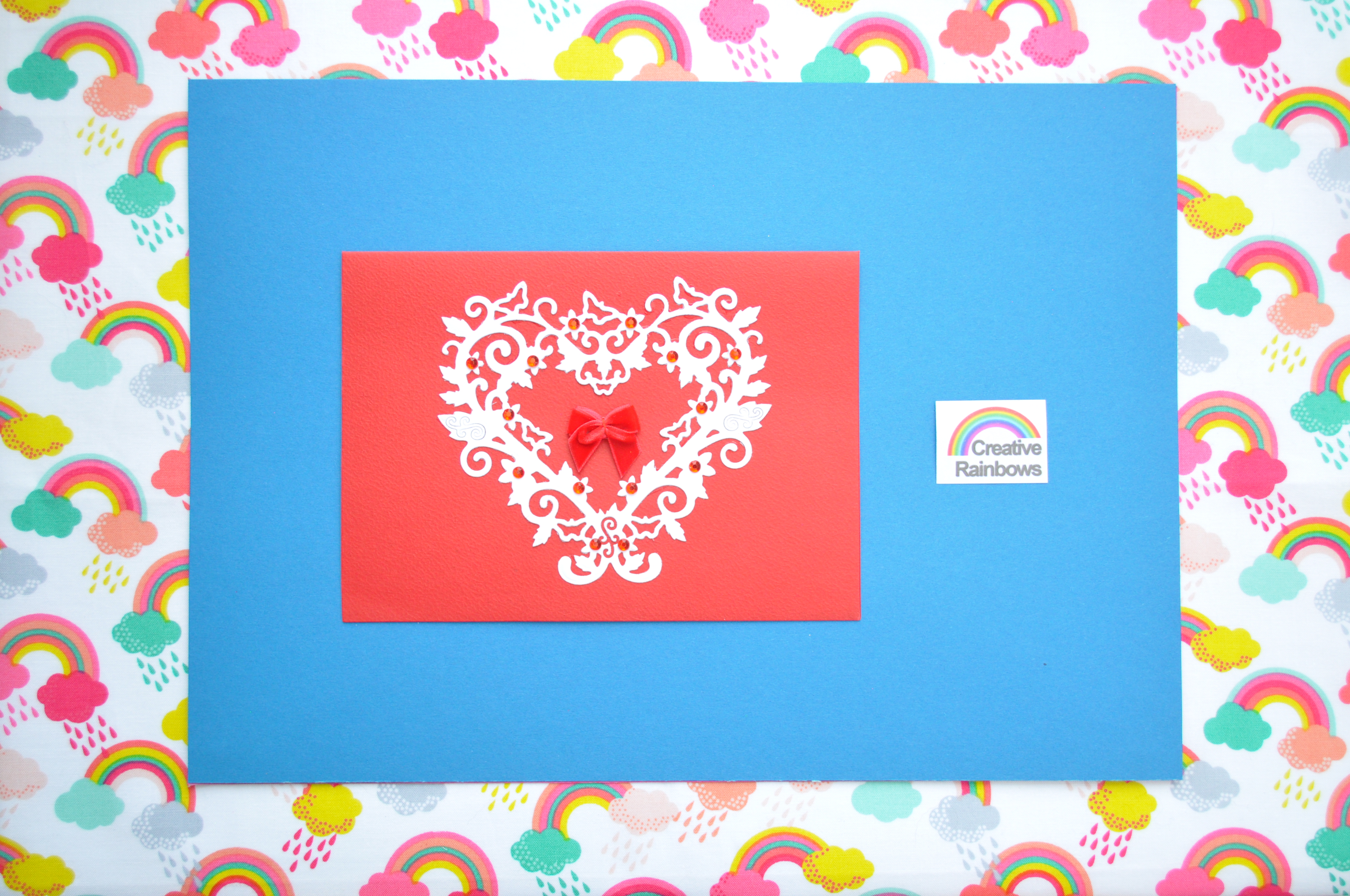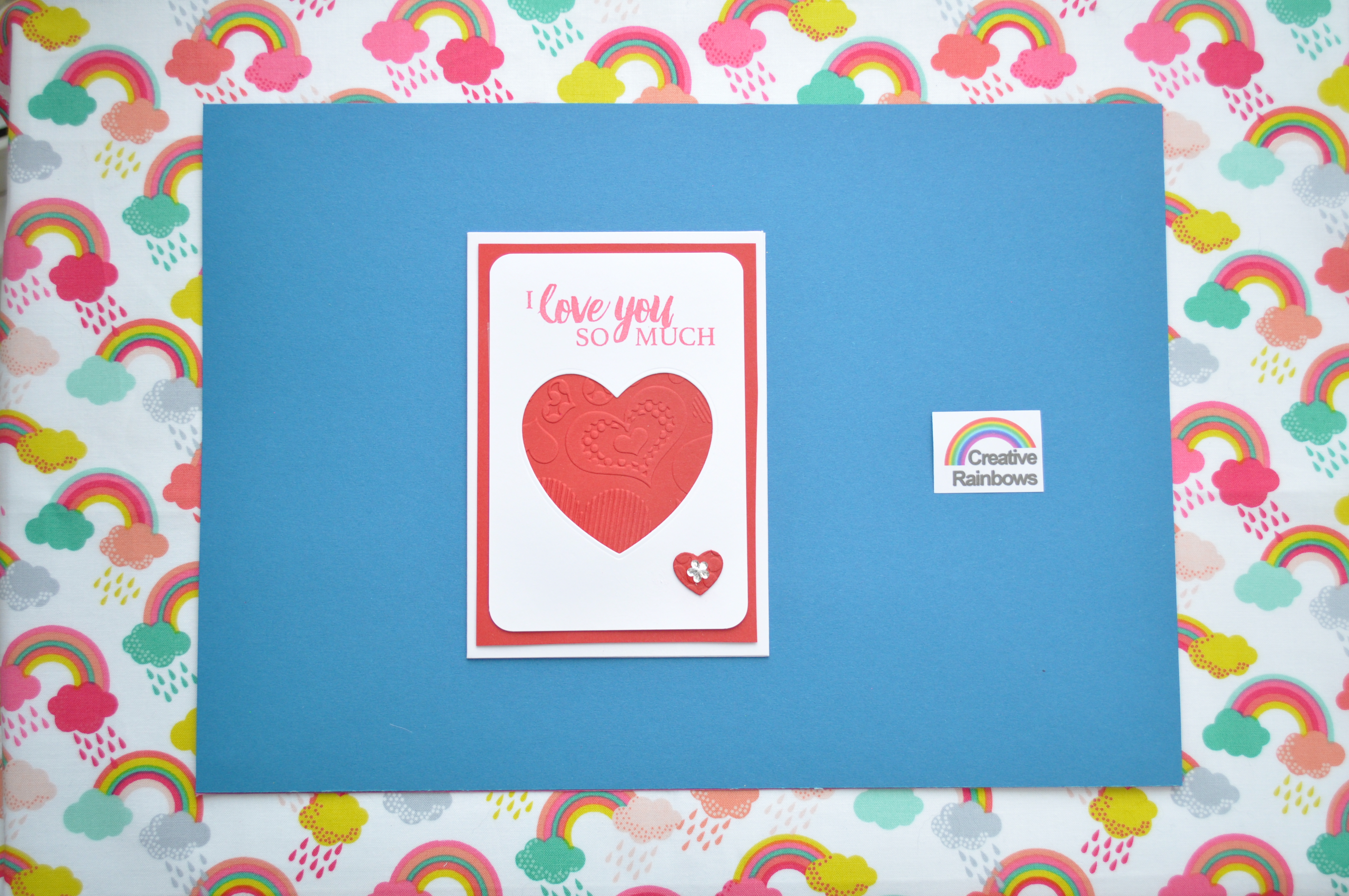 Brown card, red silver lace tape to left side with jewels, 6 mounted red heart shapes, red all my love |