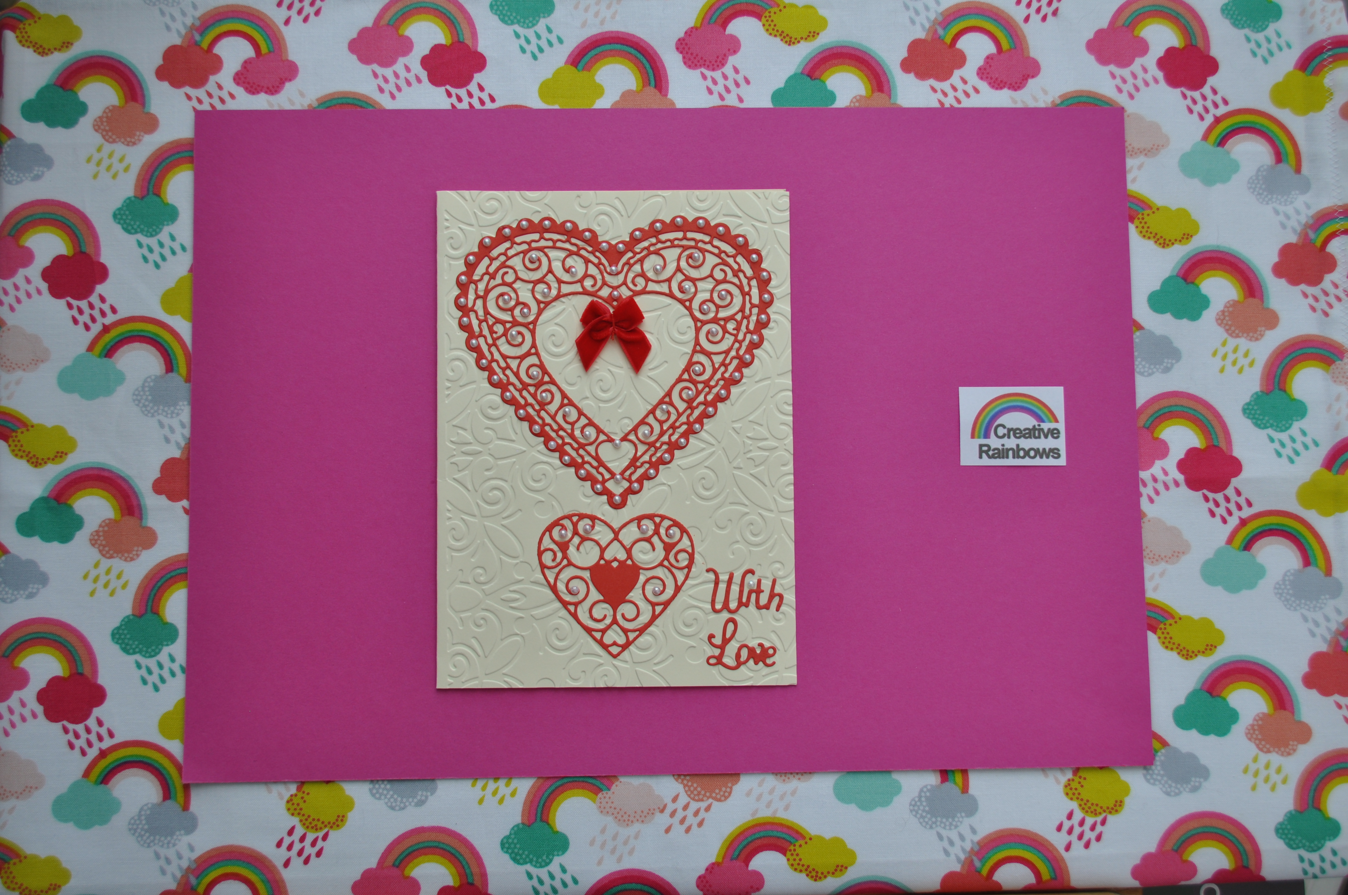 Cream Card embossed with 2 lace hearts, white pearls, red bows with love |